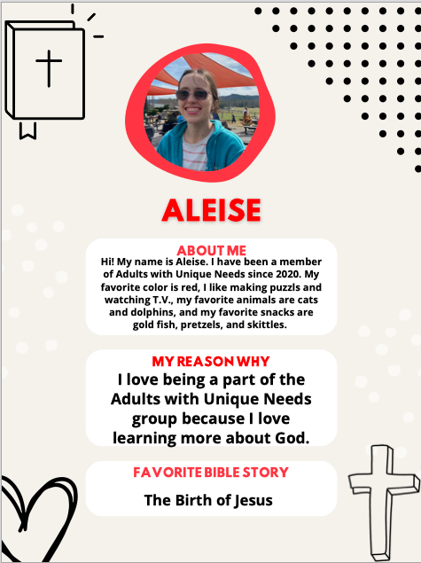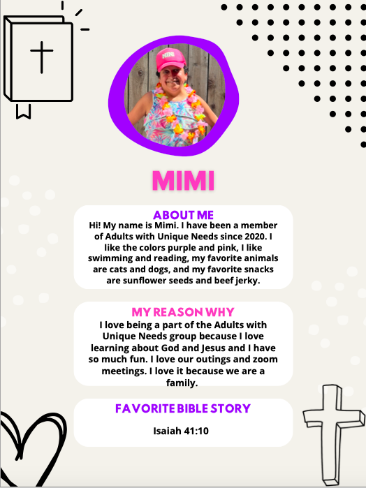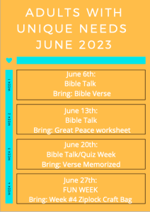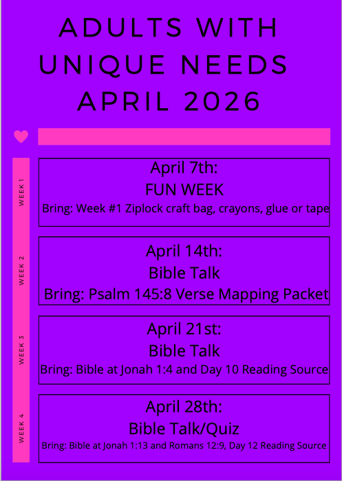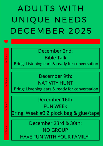 If you are new here and want to ask questions, find out more information, or get connected now with our Adults with Unique Needs group click here.