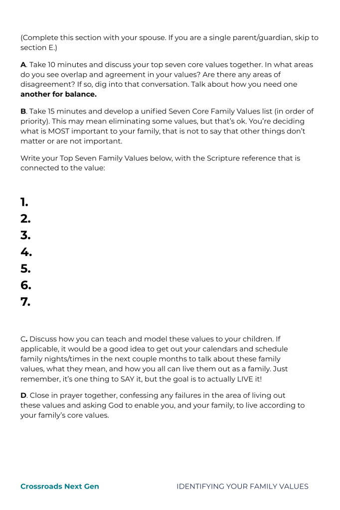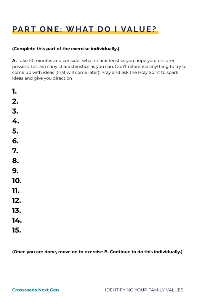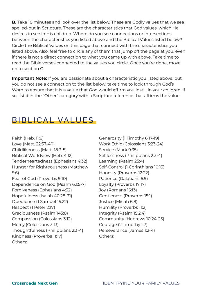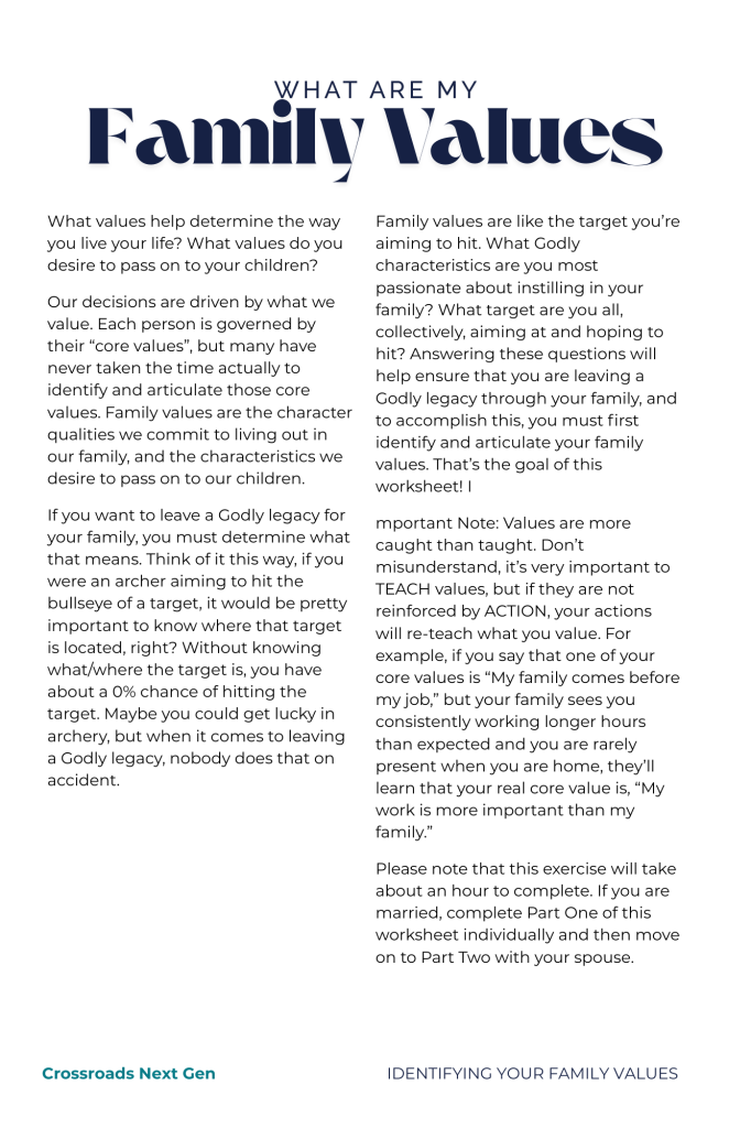 Family values are like the target you’re aiming to hit. What Godly characteristics are you most passionate about instilling in your family? What target are you all, collectively, aiming at and hoping to hit? Answering these questions will help ensure that you are leaving a Godly legacy through your family, and to accomplish this, you must first identify and articulate your family values. That’s the goal of this worksheet!