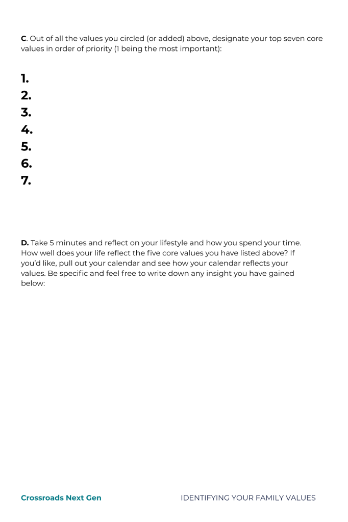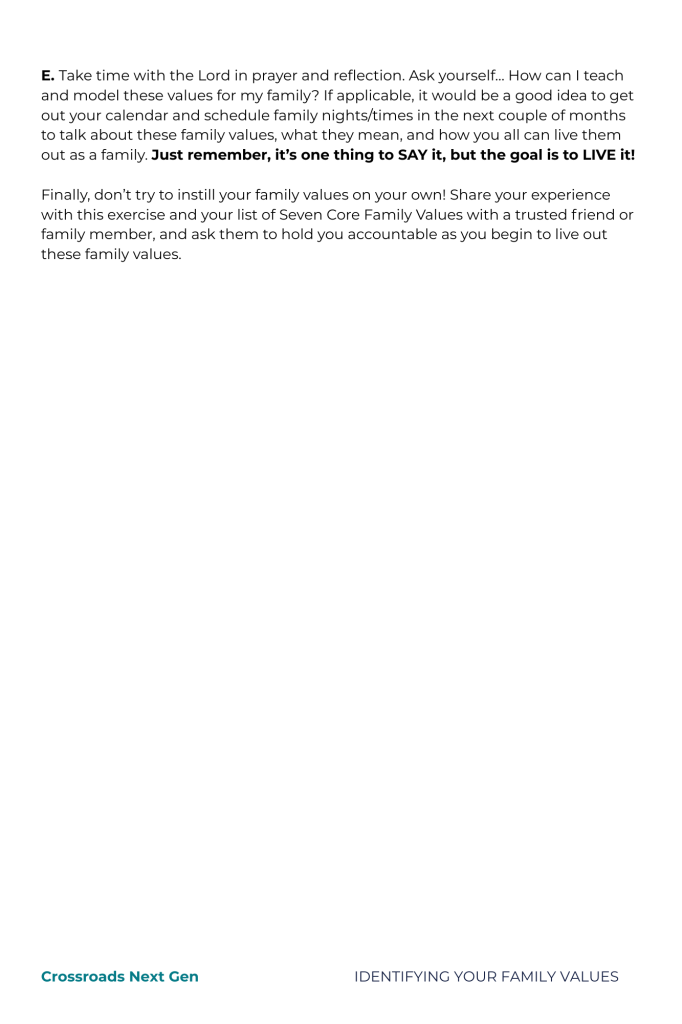 Important Note: Values are more caught than taught. Don’t misunderstand, it’s very important to TEACH values, but if they are not reinforced by ACTION, your actions will re-teach what you value. For example, if you say that one of your core values is “My family comes before my job,” but your family sees you consistently working longer hours than expected and you are rarely present when you are home, they’ll learn that your real core value is, “My work is more important than my family.”